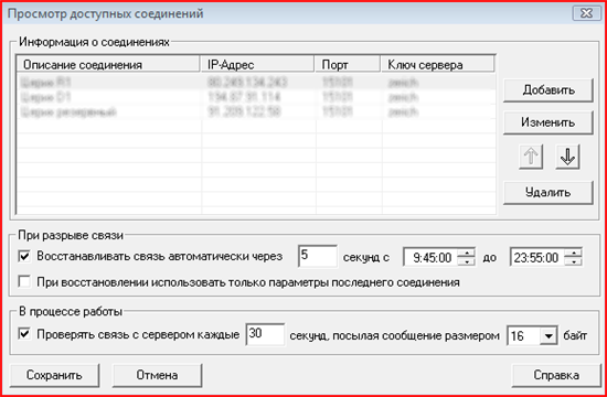 В этом окне можно настроить доступные сервера QUIK и действия при разрыве соединения.